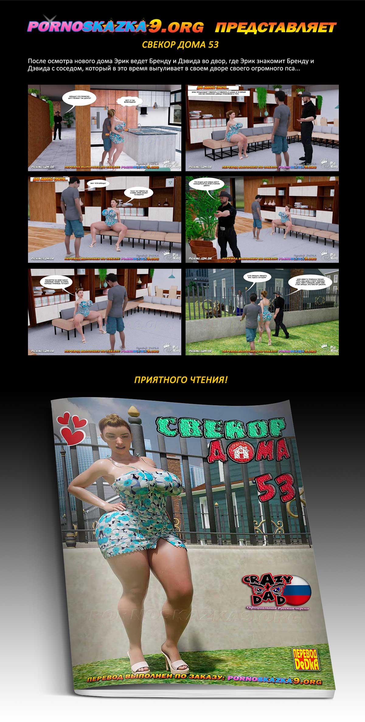 Порно комикс «Свёкор дома. Часть 53». После осмотра нового дома Эрик ведет Бренду и Дэвида во двор, где Эрик знакомит Бренду и Дэвида с соседом, который в это время выгуливает в своем дворе своего огромного пса…