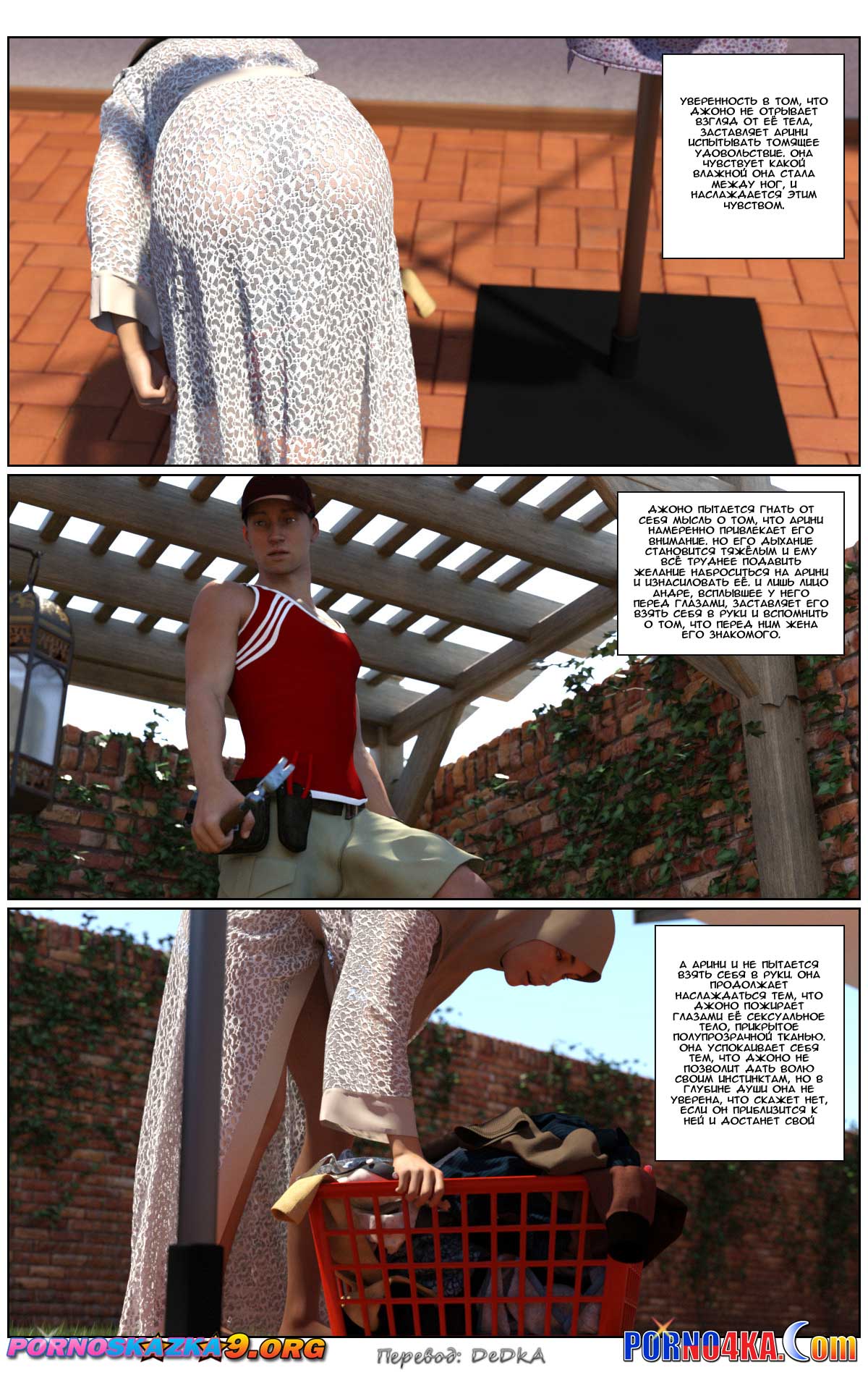 Арини, молодая красавица, бывшая модель и при этом, как ни странно, девственница и Андре, молодой, успешный и состоятельный бизнесмен однажды встретились, чтобы больше никогда не расставаться. Их брак был похож на сказку. Особенно, и это естественно, это касалось секса, которым они занимались при каждом удобном случае. Но однажды подруга Арини рассказала ей о своей счастливой сексуальной жизни, указав при этом размеры мужского достоинства её мужа. После этого Арини стала сомневаться в полноте своего счастья, ведь размеры мужского достоинства её любимого Андре, мягко говоря, не дотягивали до описанного подругой образца. А тут ещё мастер, пришедший чинить веранду, явился в таких тесных шортах, что сквозь них отчётливо просматривались очертания настоящего женского счастья и сомнения Арини усилились ещё больше…